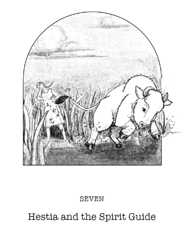 The next day I found him farther from the lake in a vast meadow stretching to the western horizon. After bathing in the lake as the sun rose, I put on fresh clothing and strolled cautiously toward him. He paid me no attention until I got within twenty paces. Grazing in the tall grass, he looked up, his jaws rhythmically gnawing. From somewhere deep in his throat, he uttered rattling sounds. I moved within ten paces. He nodded and shook off insects buzzing his head. His tail whapped across his backside. I stepped closer, approaching him from the side as one would a horse. Though he outweighed me by many hundred stones, I felt no fear. I placed my hand on his head. He did not flinch. I reached up and gently scratched the forelock between his horns and cooed, “There, there. You are one very handsome spirit guide. I’ll say that.” He twitched an ear, shook his head slightly and moaned in appreciation. I backed slowly away, giving him space and the opportunity to graze again. He remained still, gazing at me as I turned and walked back